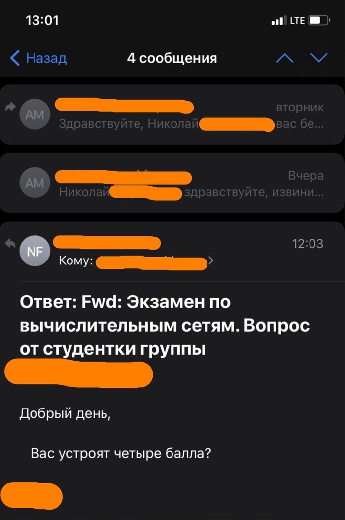 Что-то вспомнилось. Давайте, пока вокруг негатив, расскажу хорошую историю. Студенческие времена, 4 курс, я староста на потоке в 90+ человек. Была у нас на потоке девочка Даша. Даша жила на Сахалине и билеты на самолёт туда покупала, естественно, сильно заранее. И никак не могла предположить, что 28 декабря будут ещё зачёты. По закону подлости, зачёт по предмету "Вычислительные сети и телекоммуникации" таки проводился. Ничего страшного, в первый раз, что ли -- даю Даше почту препода, пишет Даша ему с объяснением ситуации, а зачётку передаёт мне. День перед зачётом, зубрю, готовлюсь. И тут она мне скидывает письмо от препода, где он ей пишет "четвёрка вас устроит?". Зубрежка немедленно была прекращена: я понял, что зачёт будет простейшим -- если уж он ей четвёрку просто так подарил. *** Идёт зачёт. Препод: -- Ну что ж, друзья, давайте начнём. Мне было лень печатать билеты и вообще надо заботиться об экологии, поэтому запускаем рандомайзер и возьмём всё из списка вопросов к экзамену! Кос