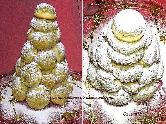 Крокембуш (croquembouche) - восхитительный французский десерт, который представляет собой конус из профитролей с начинкой, скреплённых карамелью или специальным сладким соусом. Оказывается, его готовят по особым торжественным случаям: на свадьбу, крестины или Рождество. Потрясающий вид и незабываемый вкус удивит вас и ваших близких! Сегодня я предлагаю новогодне-рождественский вариант Крокембуша. Зелень - напомнит о елке, а белая пудра о снеге. Для начинки профитролей я выбрала грейпфрутовый и клубничный кремы. Один - изысканный, в меру сладкий, с горчинкой, присущей только этому виду цитрусовых, другой - нежный и романтичный. А идею с зелеными профитрольками подсмотрела у Нины, за что ей большое спасибо! Ингредиенты: