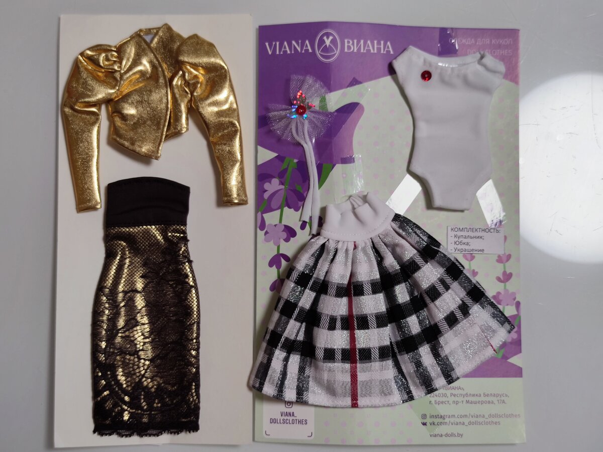 Заказала перед праздниками несколько новых нарядов для девчонок. Без каких-либо мыслей по поводу того, кому они достанутся. 🥳 Первый комплект купила ради жакета в золотом цвете (серебряный такой у меня есть и пользуется большой популярностью у девочек). А второй – ради юбки. Меня покорил клетчатый орнамент. В живую он оказался еще интереснее: на промо не было видно вкраплений люрекса. Детали 🥰 Боди Примерить новый наряд решилась Нишель. Напомню, у моей Нишель миниатюрное МТМ-тело. Поэтому боди село на нее свободно. Брошь приклеена к боди. Меня это несколько расстроило, потому что я намеревалась ее снять. Юбка Юбку натянуть было трудно. Роль резинки выполняет широкий пояс из трикотажной ткани, который пристрочен к юбке. Застежек нет. Прическа Украшение в комплекте простенькое, но симпатичное. По такому случаю я снова привела кудряшки Нишель в порядок с помощью кипятка. Как я уже говорила, волосы Нишель в кипятке не распрямляются, зато собираются обратно в локоны. Обувь К этому нар