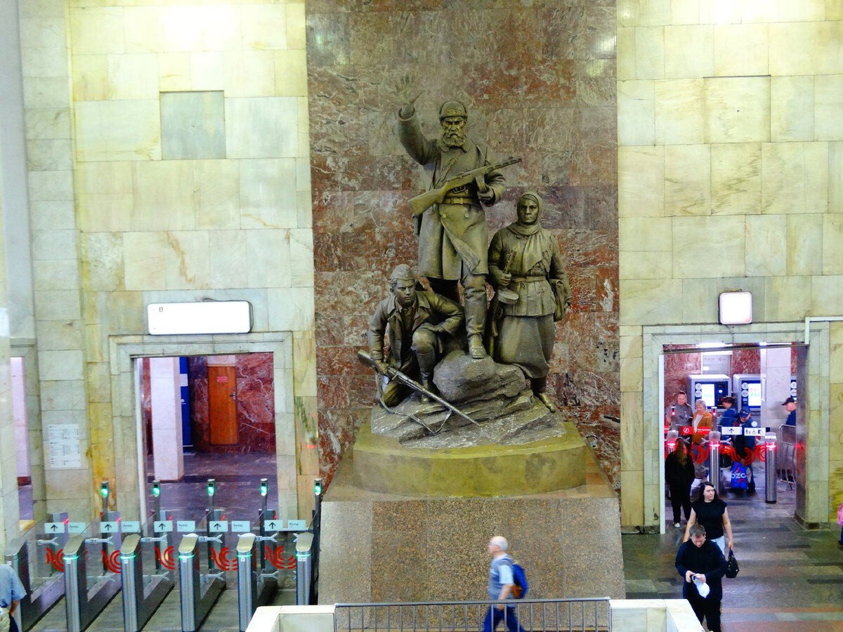 - Очень интересная станция Партизанская. Уже при входе нас встречает суровая скульптурная композиция "Партизаны". Как реалистично передана суровая решимость их лиц! Размер скульптуры усиливает впечатление.