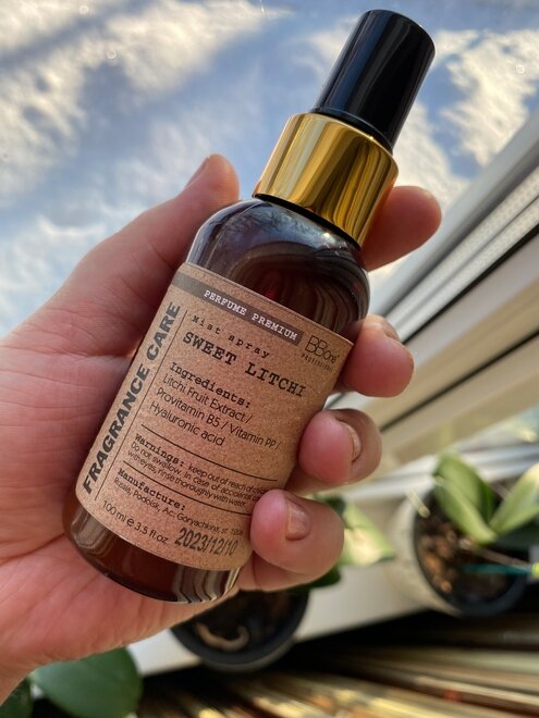 Всем доброго дня! Парфюмированный спрей для волос Fragrance Care от BB one Proffessional Mibt Spray Sweet Litchi. С продуктами BB one раннее я не была знакома. Спрей для волос купила по совету сестры. Ассортимент у этой фирмы уже приличный. Множество профессиональных средств для волос, красителей и т. д. Внешний вид у средства довольно привлекательный. Пузырёк выполнен из плотного, коричневого пластика, вся информация находится на винтажной наклейке. Сама наклейка на ощупь из матовой бумаги. Дозатор-спрей тоже из пластика, чёрный с золотом, работает исправно, не заедает. Также чёрная пластиковая крышка. Внешне очень красиво для меня. Дополнительной коробочки у меня не было, но сам пузырёк был упакован в слюду. Консистенция, жидкая, как водичка, прозрачно-белого цвета. Не чувствуется никаких кремовых текстур, просто как вода. Аромат sweet Litchi по мотивам Mugler Angel Nova очень приятный, парфюмированный. Держится на волосах до следующего мытья. Я ярко слышу аромат роз и фруктов. Объём