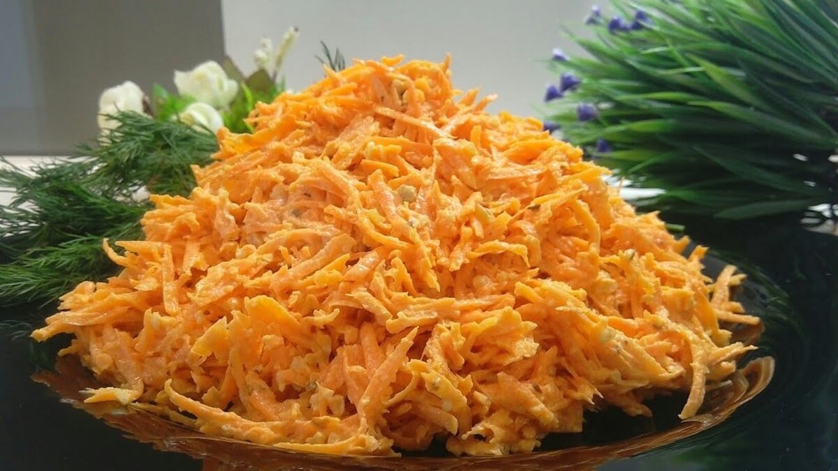 Необходимо взять полкилограмма моркови, очистить, натереть. Добавить немного чеснока и острых специй, заправить оливковым маслом, хорошенько промять, чтобы овощ пустил сок.