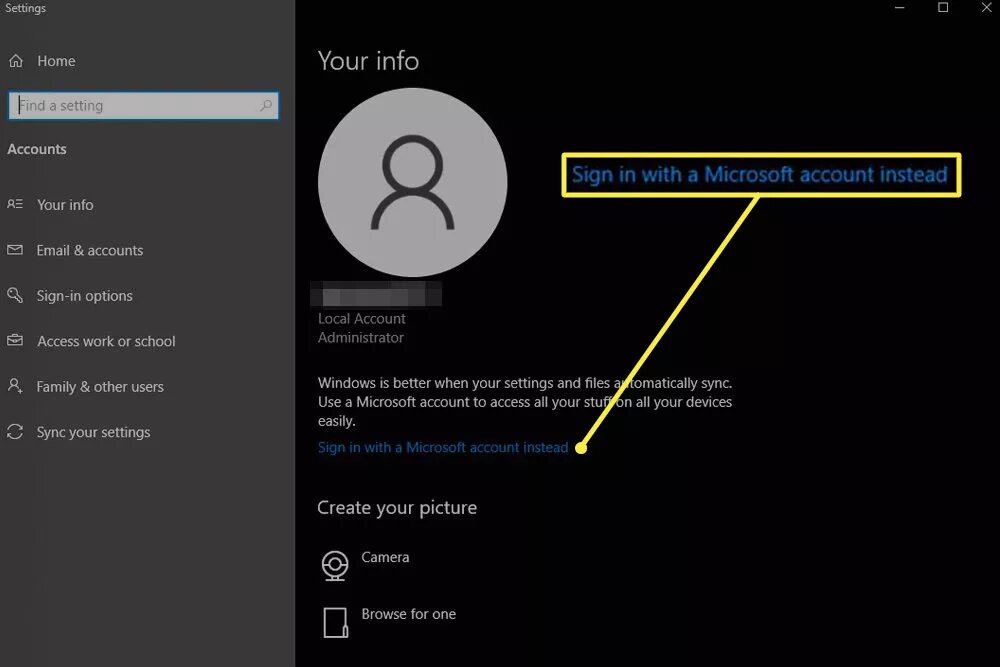 Войдите в свою учетную запись Microsoft, перейдя в раздел "Настройки" > "Учетные записи" > Ваша информация . Вместо этого выберите Войти с учетной записью Microsoft .