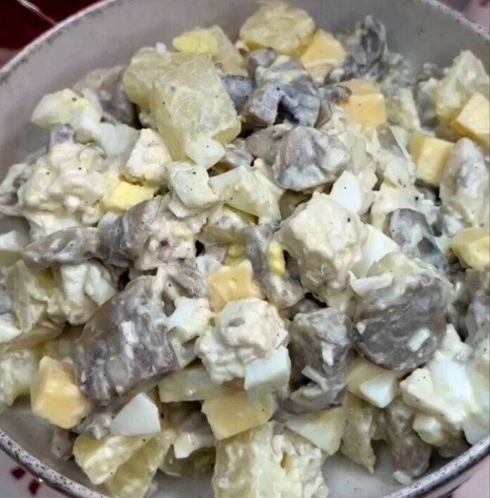 Ингредиенты: Куриное филе 3 яйца 300 гр. грибов 200 гр. сыра 1 луковица 250 гр. ананасов Соль Перец Сметана Приготовление: Куриное филе и яйца отварить, порезать на кусочки Сыр нарезать Грибы с луком обжарить на сковороде Ананасы нарезать кубиками Все приготовленные ингредиенты выложить в глубокую тарелку, посолить, поперчить. Добавить сметану и хорошо перемешать. Салат готов. Приятного аппетита!
