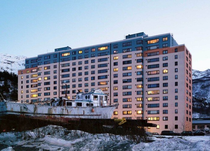 Уиттиер — город в одном здании Добро пожаловать в самый странный города на Аляске — Уиттиер (Whittier). Уиттиер — это город, который забыт как город, так как он является домом всего лишь для 220 человек. Все они живут в одном здании. Да, каждый человек живет в этой монолитной башне из кондоминиумов. За исключением одного парня, который думает, что он особенный и живет в передвижном доме по-соседству. Его зовут Пол. Но, Пол также как и все жители этого города не просто живет в одном здании — они ходят на работу, в школу и делают покупки там тоже. 14-этажное здание называется башней Бегич и блоки здания это не только жилые кондоминиумы для 220 человек, но в башне имеется все необходимое для полноценной жизни. Здание содержит полицейский участок, два продуктовых магазина, городские офисы, крытую площадку, прачечную, почтовое отделение, поликлинику и школу. Там есть даже церковь в подвале. Кто знает, почему она находится в подвале? Жители Уиттиера наслаждаются абсолютной изоляцией и живут
