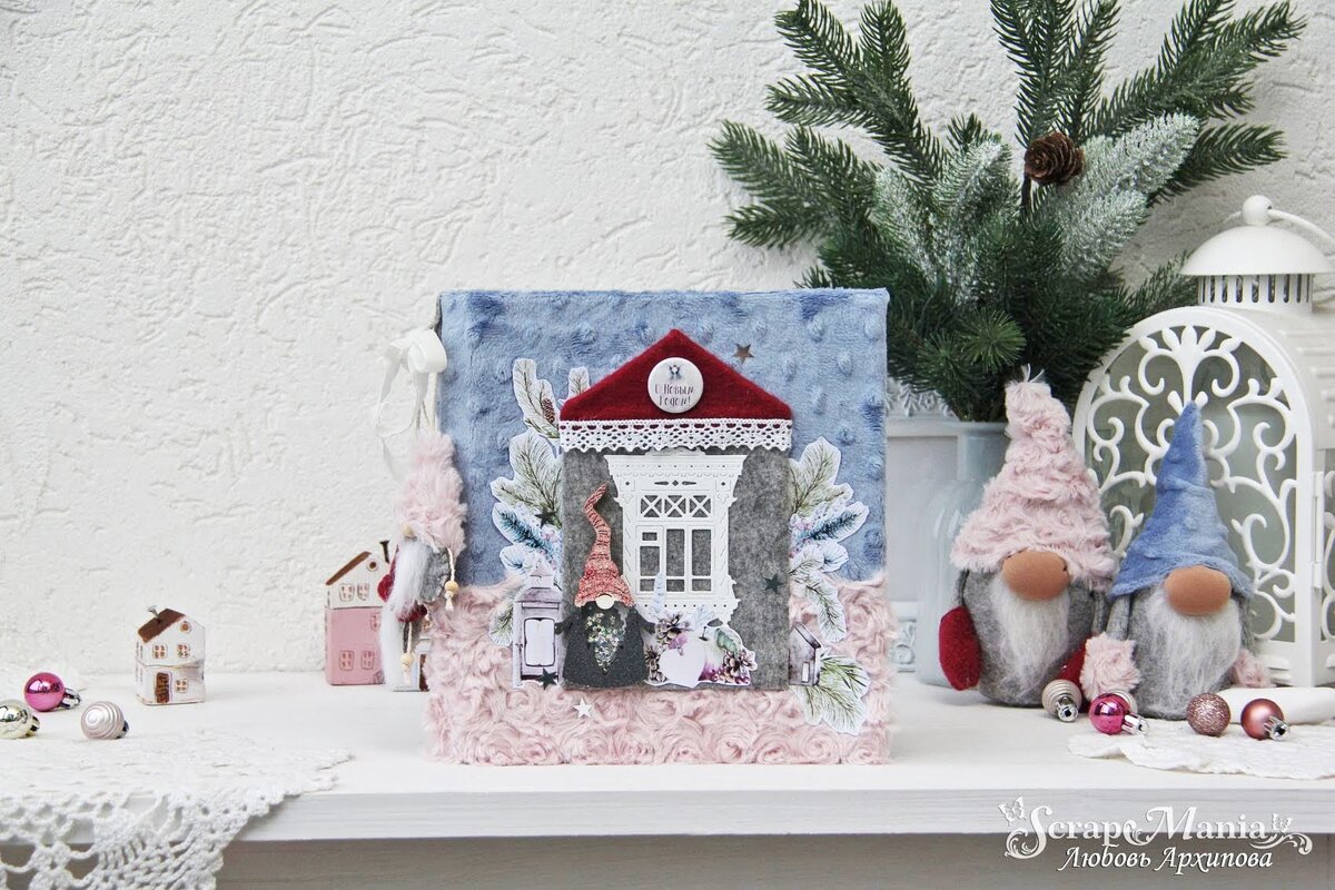 Когда ко мне в руки попала коллекция "Новогодние гномы", то я сразу решила делать из этой бумаги альбом, да не простой, а сказочный с поп-ап конструкциями. А еще я очень захотела сшить главных персонажей из этой коллекции - новогодних сканди-гномов. Вы не поверите, я ни одного подобного гнома не купила, все думала и гадала как и из чего их сшить самой. Коллекция мне подсказала)) Я взяла карточку от этой коллекции и пошла в магазин подбирать ткани. Выбрала красивый пыльно-синий плюш в рельефный горошек, пыльно-розовую меховую ткань в розочку и винного цвета флис. Ну и конечно без серого фетра не обошлось. Как раз все эти ткани пригодились и для пошива гномов, и для оформления обложки альбома.
