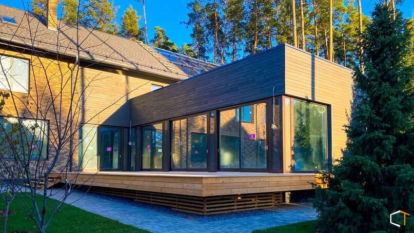 Не менее важным элементом дизайна стала лестница. Открытая конструкция с большими свесами, выполненная из прочной палубной доски толщиной 45 мм, добавляет элегантности и функциональности. А чтобы обеспечить надежность всей конструкции, касауры были изготовлены из клееной лиственницы и имеют опорную доску для дополнительной жесткости.