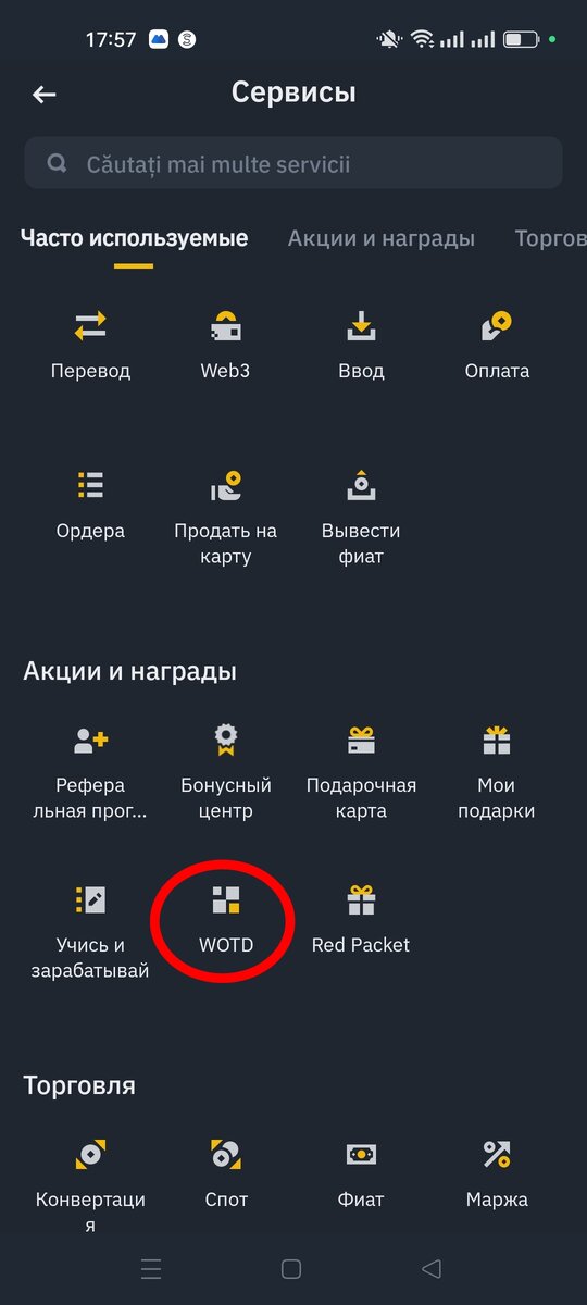 После того как вошли на Binance надо зайти в сервисы и найти игру WOTD.