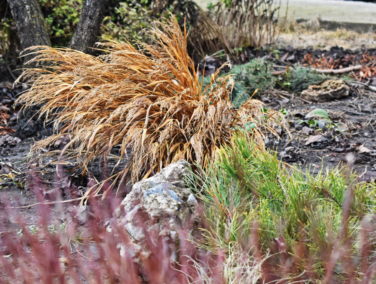 Яркая красавица, которая с весны до осени тянет к солнцу красные побеги, зимой становится тусклой. При этом кочка начинает склонять свои листья. Но если куртина большая, то выглядит это все неплохо. А небольшое растение , к сожалению, выглядит жалко. Можно было бы и обрезать. Но я не обрезаю злаки до стабильных плюсовых температур.