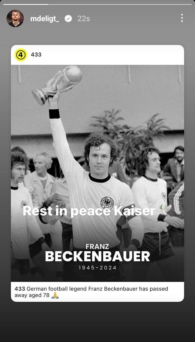 «Внезапно наш мир изменился – он стал темнее, тише, хуже. Рекордмайстер оплакивает потерю Франца Беккенбауэра, несравненного Кайзера, без которого «Бавария» никогда бы не стала тем клубом, которым является сегодня. Покойся с миром, Кайзер», – так «Бавария» сообщила болельщикам о смерти легенды клуба. В 78 лет из жизни ушел Франц Беккенбауэр – чемпион Германии, обладатель Кубка европейских чемпионов, чемпион Европы и мира, двукратный обладатель «Золотого мяча». Заслуги Кайзера невозможно описать одними титулами. Своей игрой он влюблял болельщиков в футбол, для целых поколений защитников он стал примером. Футбольный мир скорбит вместе с родными Франца и провожает легенду в последний путь. Действующие игроки «Баварии» Маттейс Де Лигт. Арийон Ибрагимович. Матис Тель. Йозуа Киммих: «Покойся с миром, Франц Беккенбауэр! Легенда и пример для всех поколений! Абсолютный идол, о котором всегда будут помнить!» Джамал Мусиала: «Один из величайших игроков всех времен. Покойся с миром, Кайзер!» Лерой