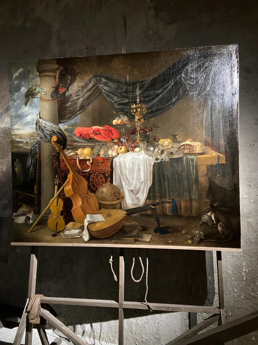 В январе этого года в Главном штабе Эрмитажа нам удалось увидеть удивительную выставку-инсталляцию «Думай о времени! Роскошный натюрморт Ян ван ден Хекке». «Роскошный натюрморт» одно из самых знаковых произведений Яна ван ден Хекке. Картина впервые предстала перед нами после реставрации. До этого хранилась в архивах Эрмитажа. Произведение представлено совершенно необычным образом. Оно находится в белом зале, в огромном чёрном кубе, что заставляет сконцентрироваться на главной мысли картины, а именно на скоротечности времени, на истинных ценностях, а не приходящих. Об этом говорит богатый выбор продуктов, дорогие ткани, посуда. Но надпись в одной из тетрадей переводится с нидерландского как «все мирские наслаждения и вещи исчезнут словно дым. Думай о времени!». Этой главной фразой и назвали данную инсталляцию. Левее картины авторы представили инсталляцию с предметами из коллекции Эрмитажа: европейское серебро, китайский фарфор, стеклянные бокалы, а также музыкальные инструменты