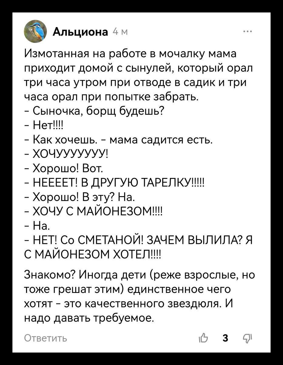 Далее мальчик говорит, что хочет с майонезом, мать кладёт майонез, сын вопит, что хотел со сметаной, и мать выливает борщ🤯