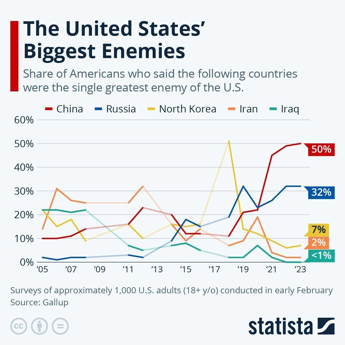 "Share of americans who said the following countries were the single greatest enemy of the U.S."