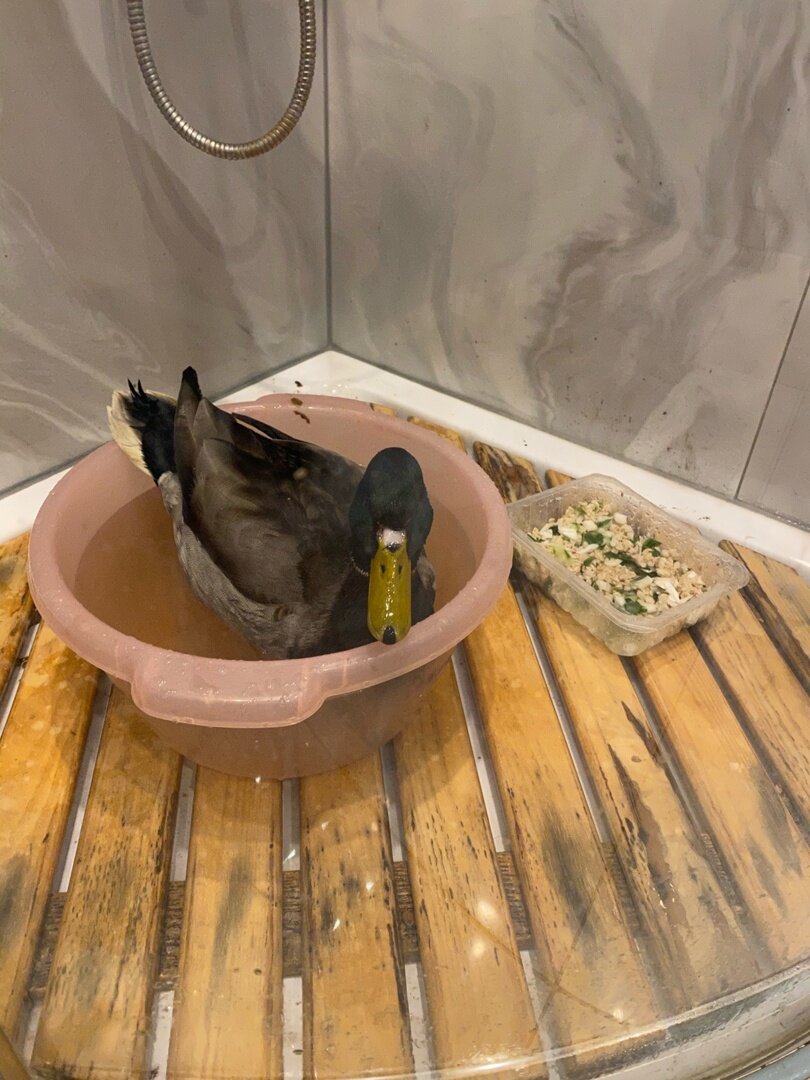 Петрозаводчане напоили и накормили Чапая, расположившегося в санузле. В паблике «Живой Петрозаводск» горожанка рассказала историю спасения селезня, обнаруженного возле моста на Древлянке. Ранее о нем написали в той же группе. По словам женщины, птица была настолько слаба, что почти не сопротивлялась. Селезня отвезли в клинику, где осмотрели его, напоили, но не смогли взять. Так утка оказалась дома у спасителей, расположившись на карантин в санузле. «У селезня помимо крыла ещё и клюв поврежден сильно… прямо нет части надклювья. Привезли домой, поставила таз с водой из пруда, не из-под крана. Запарила кашу, нарезала туда мелко овощей. Пил и ел очень жадно», — написала горожанка, уточнив, что клюв обработали мазью. Теперь Чапаю — именно так назвали селезня — подыскивают дом. Либо желающих помочь — утке нужен корм «Гаммарус тушка». «Может кто-то найдёт место для Чапая? Мы его так назвали. Завтра купим таз побольше», — написала петрозаводчанка. фото: © Живой Петрозаводск / VK