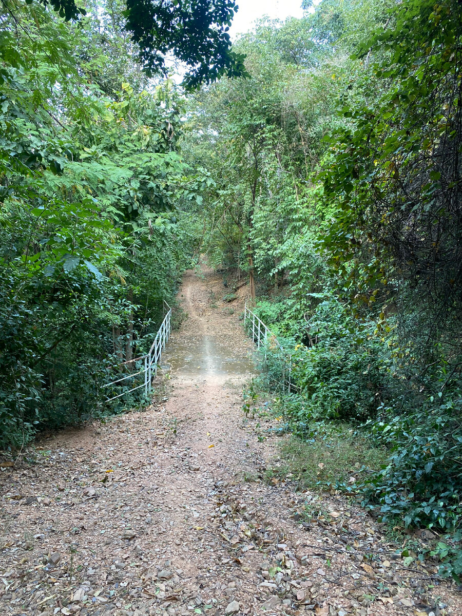 Шагнул под тегь тропических деревьев, внизу вся дорога усыпана ковром из сухой листвы. На улице +34 градуса, но тут, под сенью древ гуляет ветерок и не так жарко.