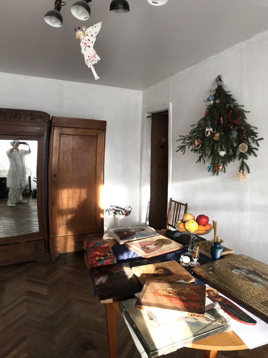 во время праздников. Ёлочка по-прежнему висит на стене, и мандарины с яблоками в вазе гранёного стекла - на месте. Солнечный свет во время морозов - сказочно полезный: Картинка в общем мало меняется - к вечеру стол пустеет, зажигаются свечи и гирлянды. На следующее утро набор икон меняется - работа на день составлена. Ноутбук с музыкой - Венский симофонический играет рождественкие вальсы и мазурки. И вот так изо дня в день.