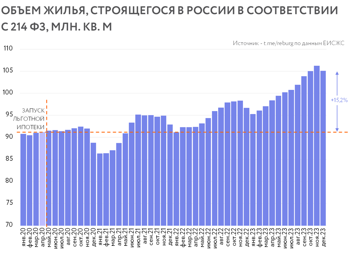 В ближайшее время будет опубликована статистика по вводу жилья в эксплуатацию за 2023 год. Эти цифры будут обсуждаться и разбираться. Но по сути это разбор "прошлогоднего снега", результата работы за предыдущие 2-3 года. Для рынка важнее - сколько проектов находится в работе в настоящий момент. Эти данные содержатся в Единой информационной системе жилищного строительства. Конец года – период, когда большое число проектов сдается в эксплуатацию и показатель текущего строительства снижается. По итогам декабря 2023 года объем жилья в стадии строительства в России сократился до 106 млн. кв. м, из них 105 млн. кв. м строится по 214-ФЗ. За последний месяц показатель снизился на 1,1%, а за год вырос на 8,7%.