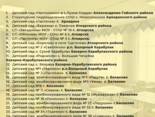 В Саратовской области в 2024 году по региональной программе отремонтируют 201 детский сад. «Изначально в проекте было запланировано приведение в порядок 100 учреждений, однако с прошлого года было решено расширить список в 2 раза. Самые востребованные виды работ: ремонт крыши, замена окон или утепление фасада», – сообщил губернатор Роман Бусаргин и опубликовал список. В Балаковском районе отремонтируют 16 детских садов. Два учреждения в селах – это Маянга и детский сад №1 в Натальино. В городе Балаково в список на ремонт попали дошокольные учреждения №2 «Ласточка», №3 «Радуга», №5 «Умка», №8, №11 «Сказка», №12 «Журавушка», №16 «Ромашка», № 22 «Ладушки», №33, №34 «Теремок», №38 «Совенок», №50 «Тополек», №62 «Золотая рыбка», и №65.