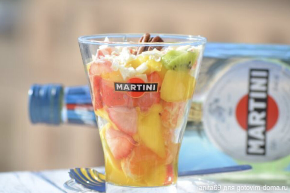Я сегодня с фруктовым салатом. Именно,что "Женское удовольствие". То что любим мы-фрукты, немного экзотические,капелька мартини,немного белого шоколада,совсем чуть чуть...И жизнь удалась! Угощайтесь! ИНГРЕДИЕНТЫ манго-1/2 шт клубника-100 г киви-1 шт мандарин-1 шт Для заправки мартини-50 мл сироп кленовый или мёд-1-2 ч.л. Для подачи шоколад белый-по вкусу Фрукты моем и нарезаем. Умоляю!Яблоко в этот салат не нужно! Заменять фрукты или их количество можно по вкусу.Хорошо подойдёт малина,спелая груша,ананас. Делаем заправку,смешав мартини и кленовый сироп.Можно,конечно,заменить мёдом. Заправляем салат. Раскладываем в красивые стаканы. Сверху украшаем натёртым белым шоколадом. Если не хотите,то и не нужно.Но чёрный или молочный не рекомендую,"не звучит". Можно добавить пару листиков миндаля или орешек по вкусу. Приятного аппетита