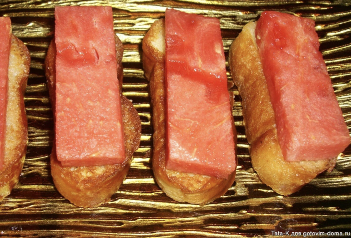 Арбуз нарезать пластинами и уложить сверху гренок.