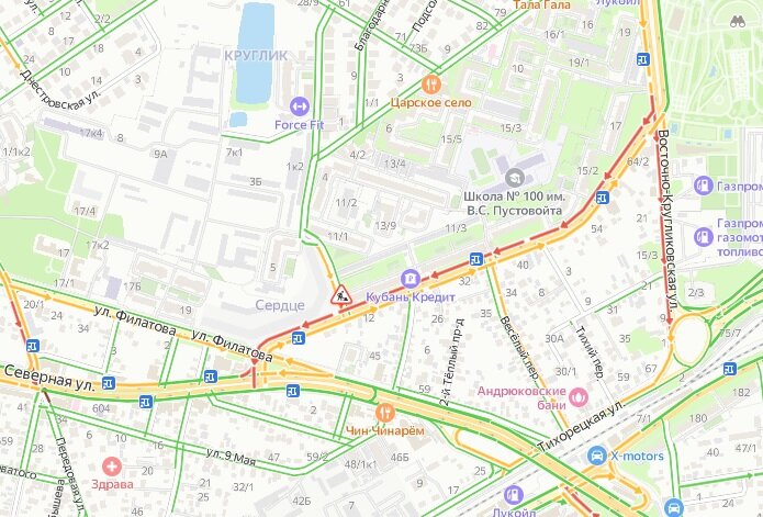 К 09:30 заторы в городе уменьшились. Но несмотря на то, что в целом пробки составляют только три балла, на карте дорожной ситуации улица Школьная до сих пор окрашена в красный цвет. Отмечено и место, где идут дорожные работы. Это крайний правый ряд по ходу движения к улице Филатова, в районе строящегося жилого комплекса. Затор на улице Школьной. Фото: скриншот "Яндекс. Карты"