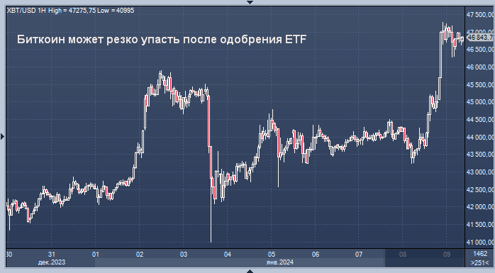 Доллар стабилен, а биткоин подскочил в ожидании одобрения ETF График биткоина интервалами в 60 минут Доллар приостановил свой подъем во вторник, поскольку трейдеры ориентируются на значительное снижение ставок Федеральной резервной системой в этом году, полагая, что инфляция в США замедляется достаточно. Что касается криптовалют, биткойн колеблется вблизи самого высокого уровня с апреля 2022 года на фоне растущего ожидания скорого одобрения спотовых биржевых фондов биткойнов (ETF). В последний раз евро держался на уровне $1,0949, что ниже недавнего трехнедельного минимума в $1,0877, в то время как японская иена дистанцировалась от уровня 145 за доллар после значительного снижения гринбека на фоне падения доходности казначейских облигаций США. Частично эти шаги были обусловлены последним исследованием потребительских ожиданий Федерального резервного банка Нью-Йорка, которое показало, что прогнозы потребителей США относительно инфляции в краткосрочной перспективе упали в декабре до самог