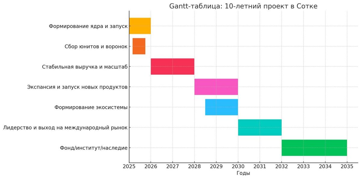 Ганта для 10-летнего проекта в Сотке: от запуска создания до экосистемы и сохранения