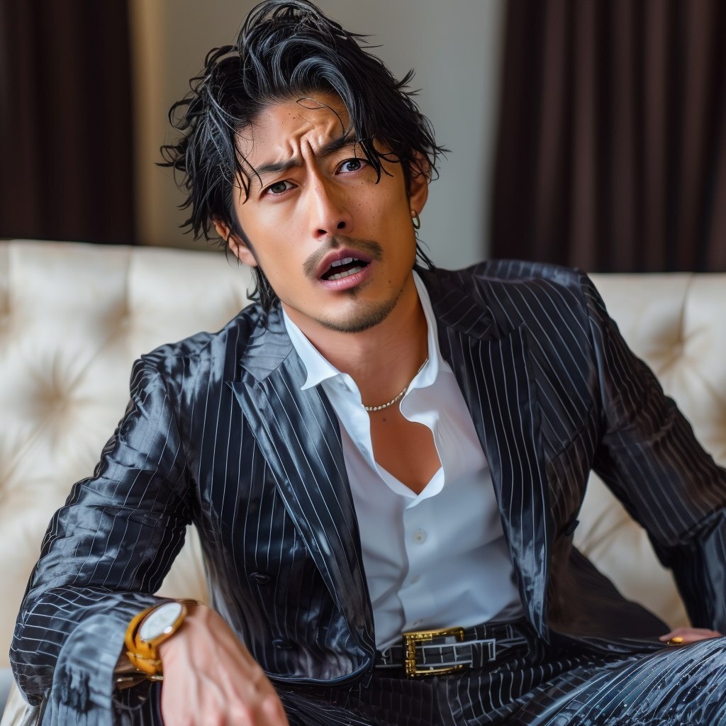 Создано на основе запроса: Wild spiky hair,gold color hair,suit,belt,sitting on the sofa