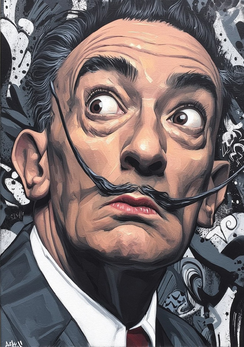 Создано на основе запроса: Salvador Dalì cartoon realism, graffiti, hip-hop, mythic, mystical, elegant, black grey white gold