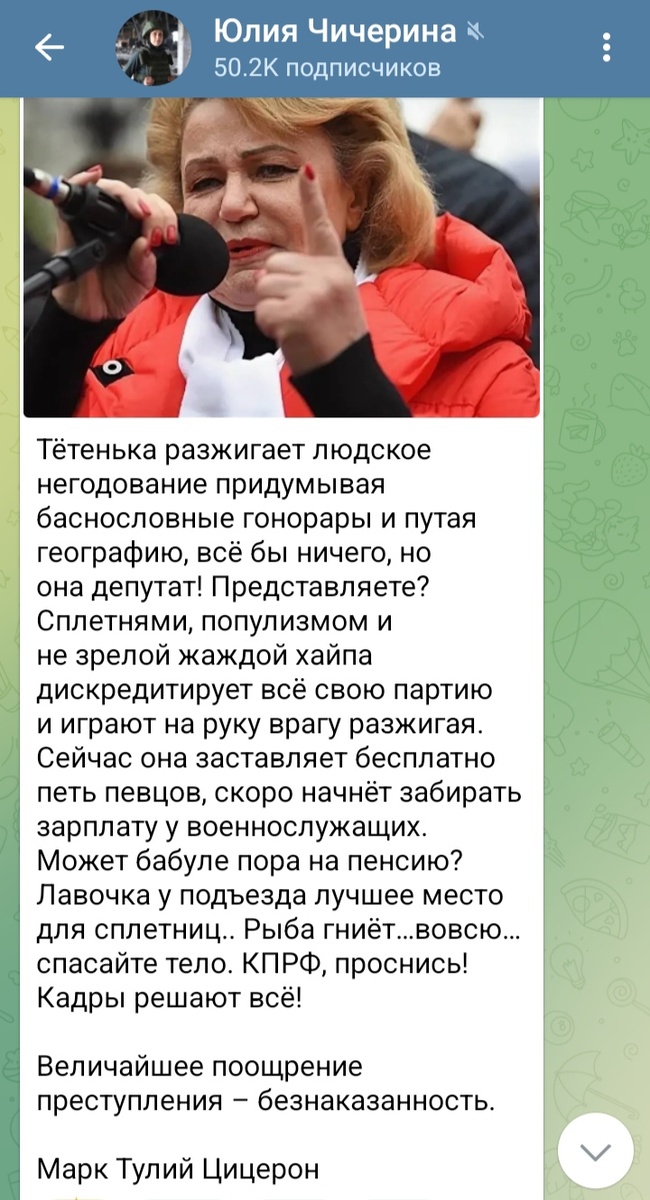 Вот ведь. Ну надо же. Этого не может быть потому, что этого не может быть никогда! Юлия Владимировна Чичерина изволит гневаться на г-жу Останину. Кипит её разум возмущённый, и куда-то даже идти готов, как мне кажется. И слова ведь правильные, красивые, взывающие. Но. Не верится. Ну никак не верится. Не может же быть такого, чтобы Юлия только что начала смотреть сериал "Нина Останина: распределительница гонораров". Конечно, нет. Просто в первых сериях трепали честные имена тех людей, которые Юле и самой не очень приятно слышать. И людского негодования вокруг себя она не наблюдала, ровно по той же причине. А тут, ишь ты, вознегодовали онЕ. Да, Юль, сплетни. Да, популизм. Да, жажда хайпа, но зрелая, даже перезрелая. Но в прошлом году было ровно то же самое. Только кусали Шамана. И он не нервничал, Юль. Он не оправдывается. Ему не в чем. И сейчас метили в него, а попали в тебя, Юль. Это неправильно, естественно. Но избирательное, выборочное негодование - не менее неправильно.