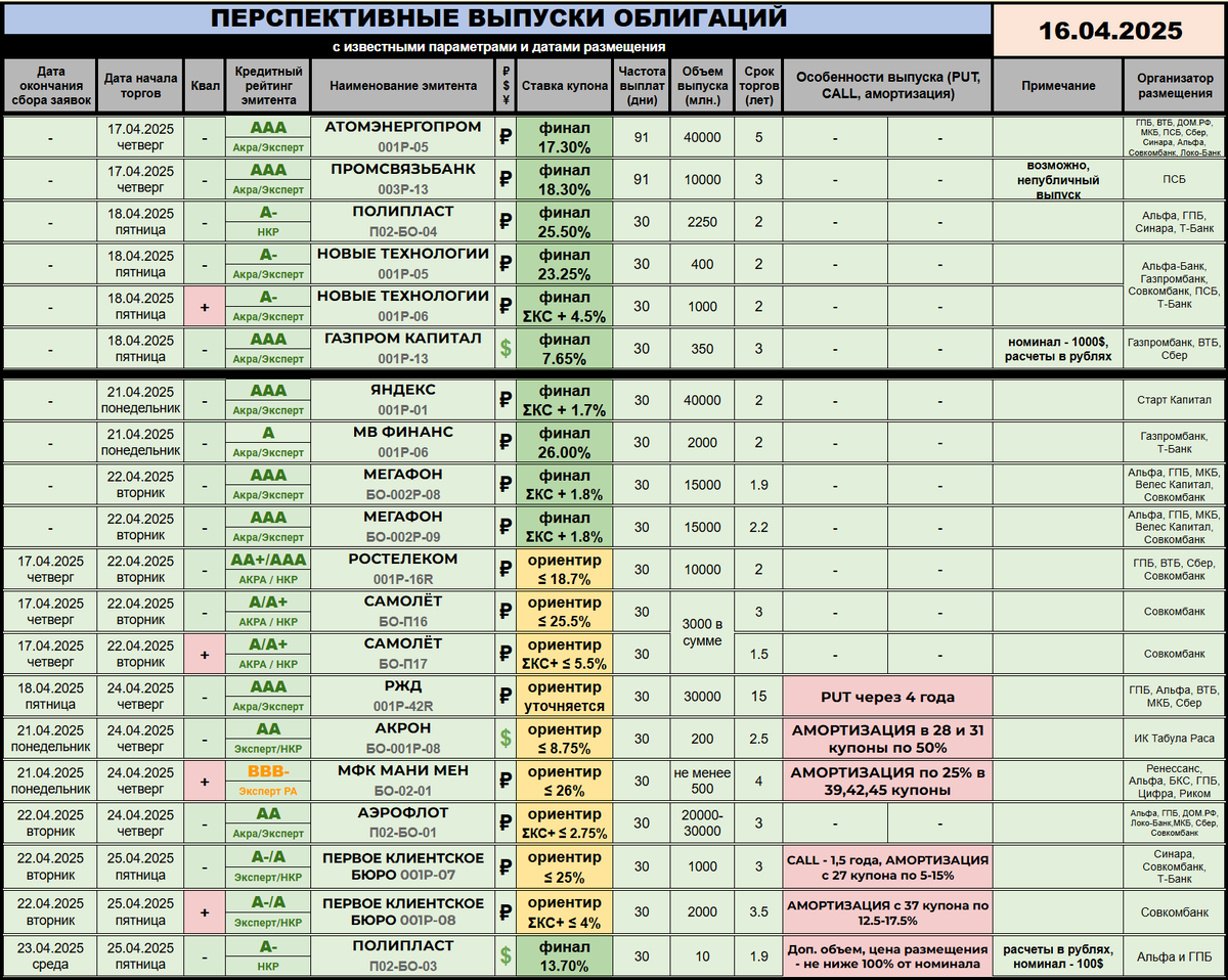 😉 Торговый день плавно приближается к своему справедливому завершению, пора и пожать новостной урожай. Удался ли? Сейчас посмотрим... ---------- 🆕 НОВЫЕ РАЗМЕЩЕНИЯ / АНОНСЫ: 🌷 Эмитент ПОЛИПЛАСТ (🅰️➖) очень любит напоминать о себе крайне регулярно. Вчера компания собрала рублевый выпуск, а сегодня предлагает дополнительный объем по уже имеющемуся квазивалютному. Сбор заявок по бумаге П02-БО-03 $RU000A10B4J5 на 10 миллионов долларов пройдет 23 апреля. Параметры выпуска и купон тут не сюрприз - примерно 1,9 года осталось до погашения, в комплекте ежемесячный купон с выплатами в рублях в размере 13,7%. Основная интрига - цена размещения, на старте она составит "не ниже 100% от номинала", а там видно будет :) Дополнительный объем раздадут по портфелям 25 апреля, организаторы пира - Альфа и ГПБ. 🌷 Не нравится Полипласт? Вас спасет АКРОН (🅰️🅰️), который также предлагает выпуск в долларах с рублевыми расчетами. Сбор на 200 миллионов долларов состоится 21 апреля, в понедельник. 2,5 го