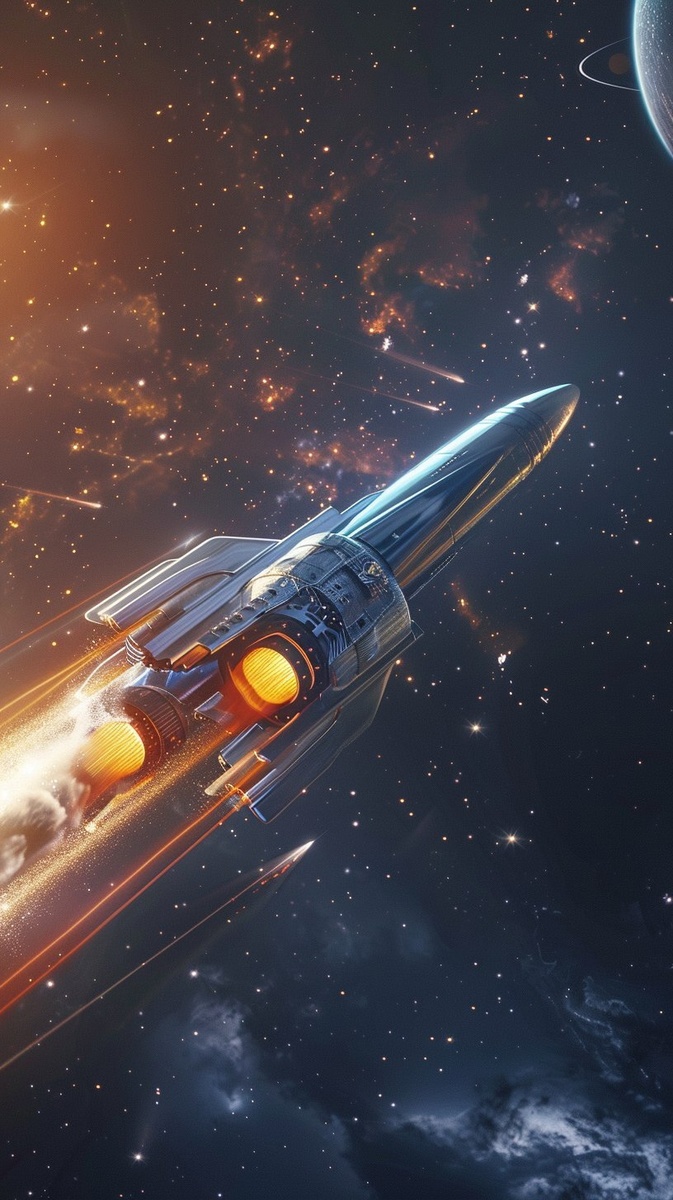 Создано на основе запроса: A sleek spacecraft with the cat inside launching back into space, trail of stardust behind, emotional final shot