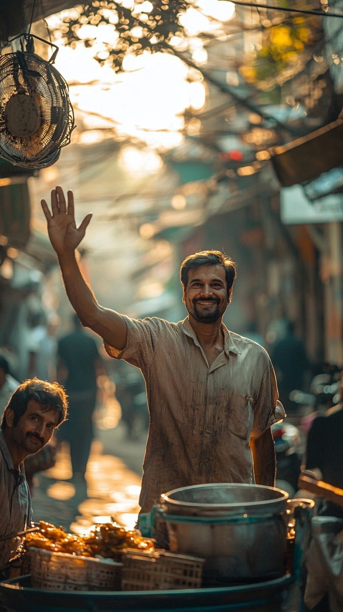 Создано на основе запроса: a man waving with a smile from a distance, street vendor looking toward him in gratitude, street bathed in soft