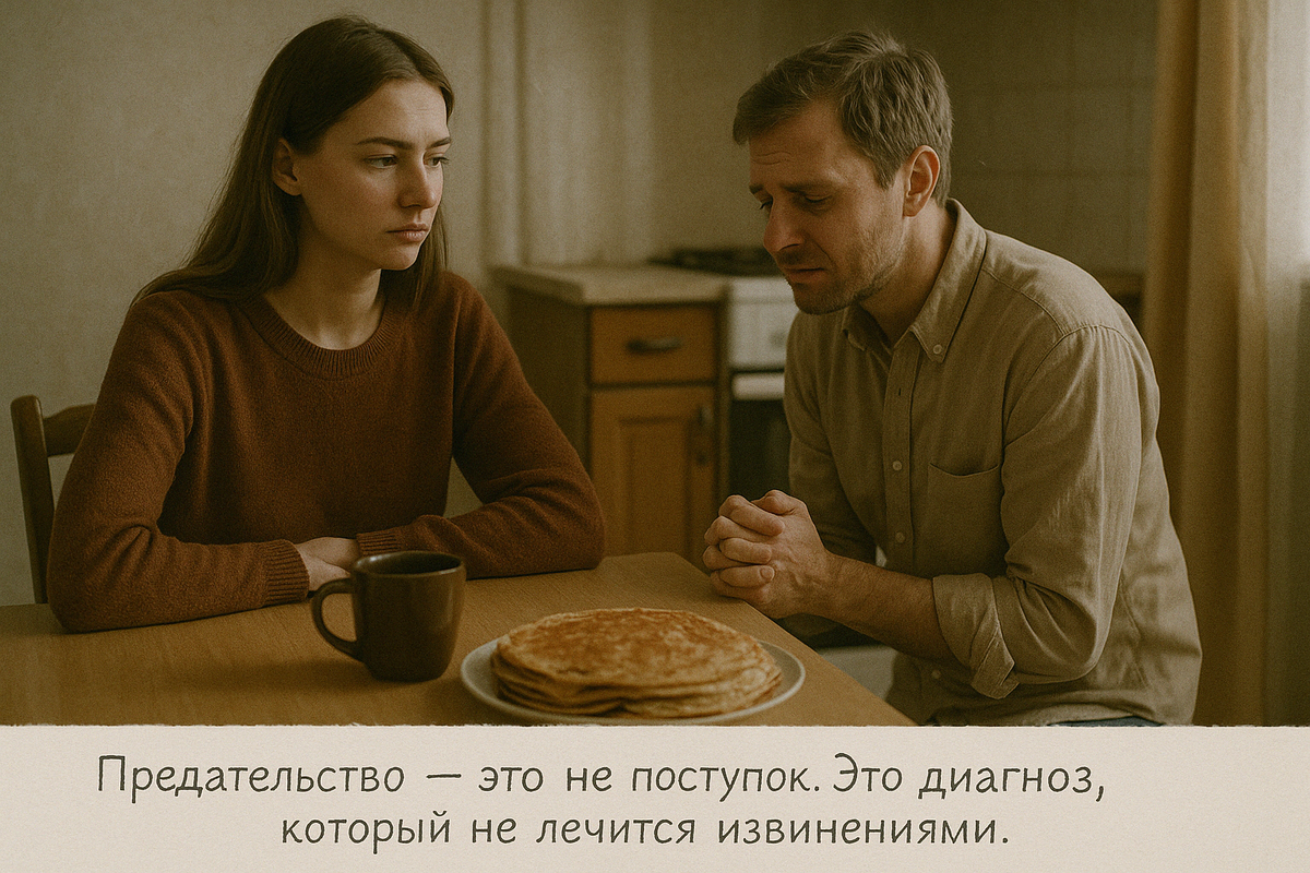 Когда он пришёл — да, именно «пришёл», как потерянный щенок, которого два дня назад выкинули с третьего этажа эмоций, — я жарила блины. Масло шкворчало, сахар карамелизовался по краям, а на кухне пахло детством. — Привет, — сказал он, как будто зашёл за солью. Я не ответила. Даже не повернулась. Потому что если бы повернулась, всмотрелась в это вечно уставшее лицо, я могла бы… Нет. Я ничего бы не сделала. Я бы просто всё вспомнила. А мне это было ни к чему. — Мне нужно с тобой поговорить. Я перевернула блин. Аккуратно, одной рукой, как учила мама. Блин порвался. Символично. Заметил он? — Пять минут. Пожалуйста. Я поставила сковородку в раковину, вытерла руки о фартук, сняла его. Медленно, демонстративно. И всё так же молча направилась в зал. Если кто-то и должен был управлять этим абсурдным спектаклем, то точно не он. Он сел на край дивана, как студент на пересдаче. И начал: — Я не знаю, с чего начать… — Попробуй с извинений. Не стандартного «прости, я был дураком», а нормального. С