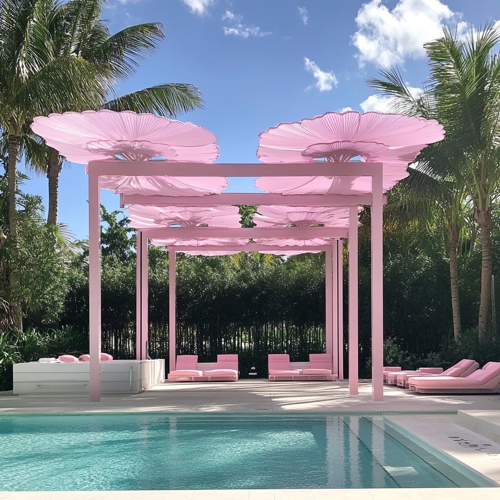 Создано на основе запроса: pale pink metal single palm leaves shade structure for a pool resort in Miami tropical lush planting