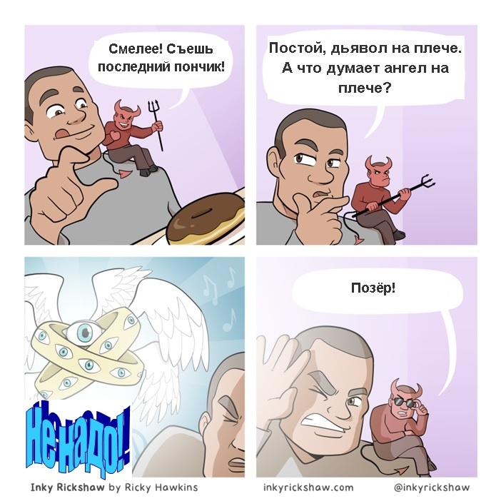Сегодня предлагаю глянуть на серию шуточных стрипов "Чернильная рикша" (по-английски Inky Rickshaw). Рисует яркие, мультяшные истории с оригинальным юморком, британский художник Рики Хокинс. По профессии - школьный учитель. По призванию - шутник и весельчак. Откуда такое необычное название inkyrickshaw? Всё просто. Это - анаграмма. Переставил автор буквы своих имени и фамилии Ricky Hawkins - получилась чудная, запоминающаяся фраза. Чем не название для собственного проекта? Комиксы выходят на официальном сайте серии с 2018 г. на английском. Юмор здесь порой бывает тонкий, с игрой слов на оригинале. Но есть шутки понятные на любом языке, что позволяет не запариваться с адаптацией на русский. Вообще, у художника масса тем: бытовушные, про кино и видеоигры, сказочные и мифологические переделки, кошмарики и фэнтези. Для этого выпуска выбрала последнюю темку. Перевела тут для вас на досуге 13 комиксов. Надеюсь, вам понравится. Приятного чтения и настроения) Больше всего историй в этой статье