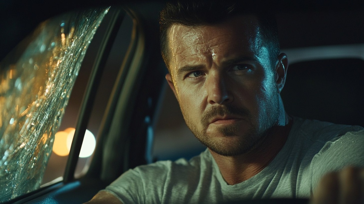 Создано на основе запроса: a man in his 30s, short dark hair, light beard, light skin tone, wearing a grey t-shirt, driving a car at night