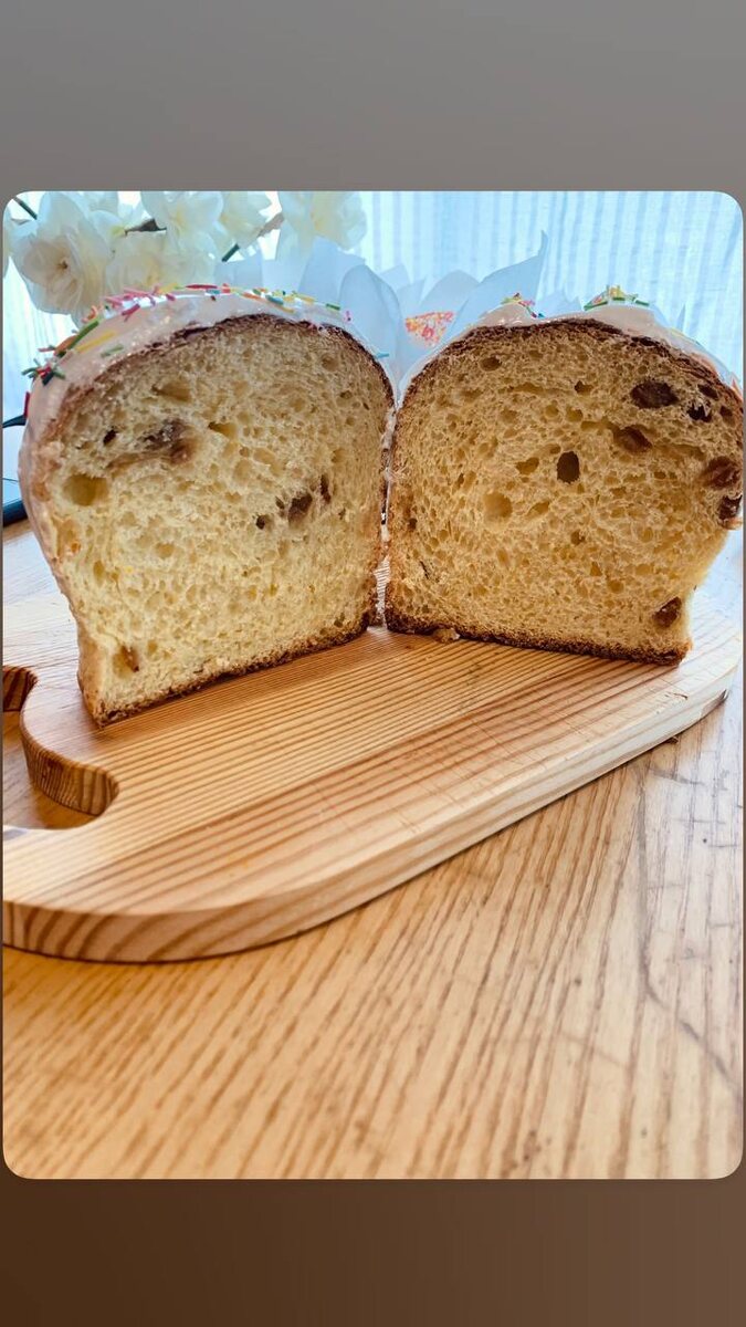 Кулич с плотным влажным мякишем на закваске Левито мадре с изюмом.