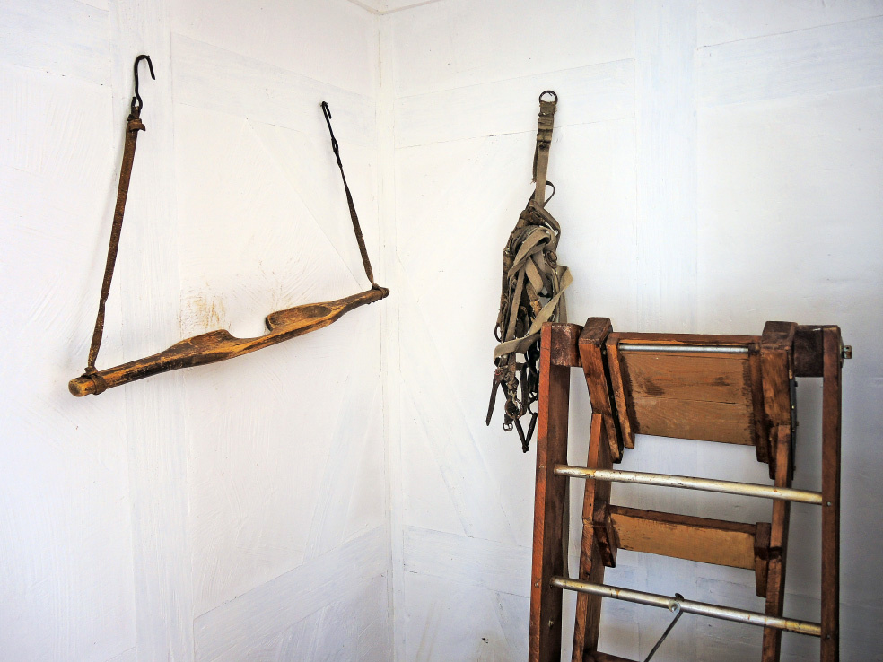 Небольшие сени около входной двери перед входом в основную комнату. Здесь хранили различные предметы, которые могли понадобиться для выхода на улицу - сани, лопаты, элементы конской упряжи и т. п. Предмет, который висит на стене, экскурсовод предложила нам угадать. Правда, угадайка была не совсем честная, потому что предмет висит вверх ногами. Опознали? Вот и мы не смогли. Это коромысло. В средней части оно имеет расширение и выемку под плечи, которые значительно облегчают переноску вёдер.