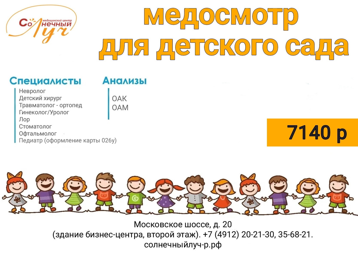 Открывается новая глава в жизни вашего малыша – скоро он отправится в детский сад! Но перед этим важно пройти медицинский осмотр, чтобы убедиться, что ребёнок здоров и готов к новому этапу. В медицинском центре "Солнечный луч" мы сделали этот процесс быстрым, комфортным и доступным! Работаем ежедневно с 07.30 до 20:00.