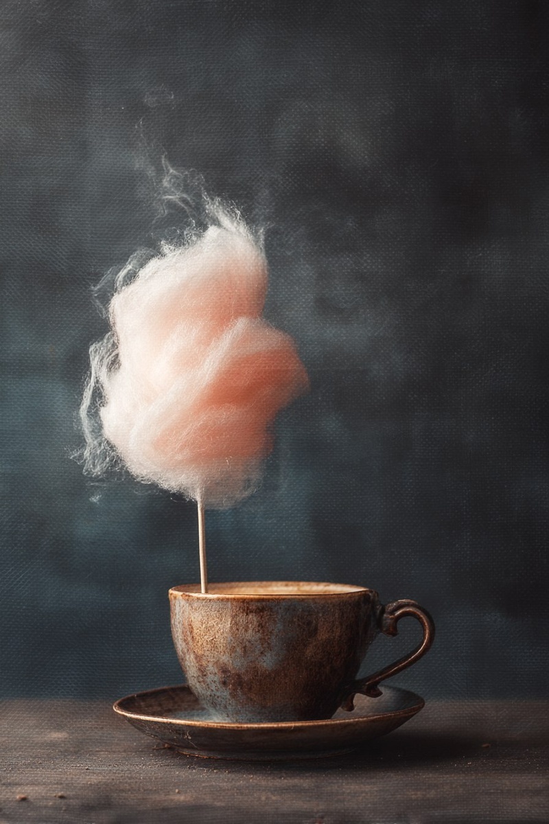 Создано на основе запроса: Fusion cuisine, Cotton Candy Coffee Sweet Little Rain Coffee, light art, black background, vintage