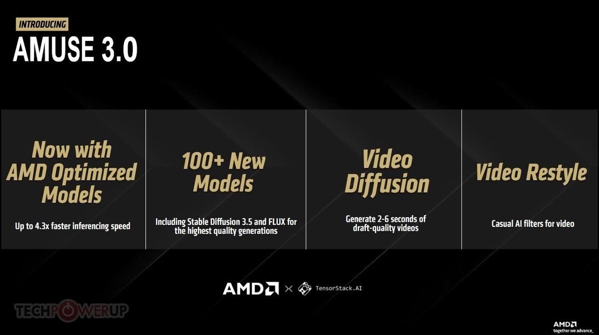 AMD объявила о выпуске новой версии набора программного обеспечения Amuse под номером 3.0 для локальной генерации изображений и коротких видео при помощи искусственного интеллекта (ИИ) с ускорением на поддерживаемых процессорах AMD Ryzen AI и видеокартах Radeon RX, сообщает TechPowerUp. Источник изображения: AMD, TechPowerUp Программное обеспечение разрабатывается в сотрудничестве с компанией TensorStack AI и предоставляет доступ к обширной библиотеке ИИ моделей, специально оптимизированных для запуска на оборудовании AMD. В библиотеке насчитывается более сотни различных моделей, включая модели семейства Stable Diffusion 3.5 и FLUX для генерации изображений по текстовому описанию. Помимо генерации изображений доступна генерация видео в низком разрешении длиной до 2…6 секунд, а также обработка изображений и видео с помощью нейронных фильтров. Для поддержки Amuse 3.0 и оптимизированных ИИ моделей выпущен новый графический драйвер AMD Software: Adrenalin Edition 24.30.31.05. Это предварит