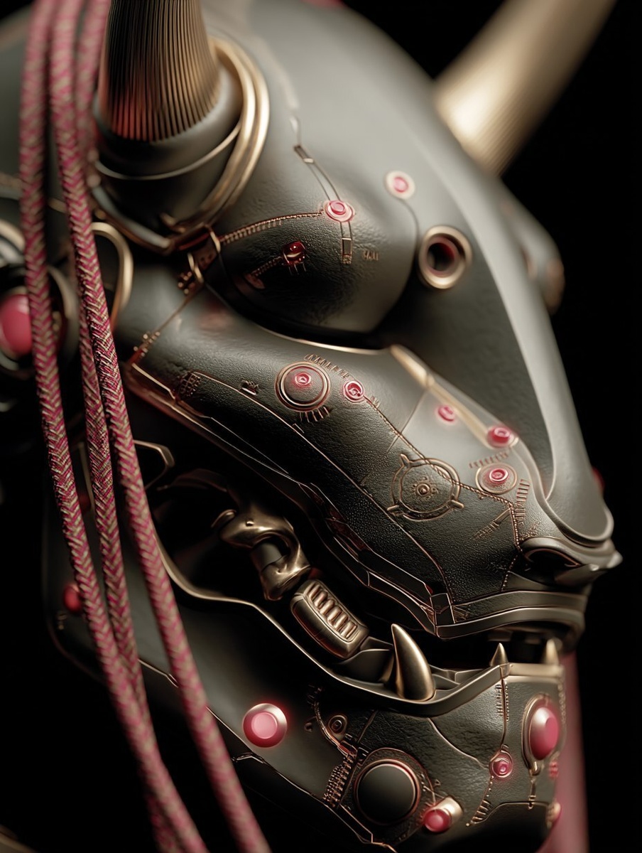 Создано на основе запроса: A futuristic yokai mask made of dark titanium with glass joints and red LEDs, centered in the scene on a dark background, ultra detailed and realistic render --- Автоперевод: Футуристическая маска йокай из темного титана со стеклянными соединениями и красными светодиодами, сосредоточенная на сцене на темном фоне, ультра -детальный и реалистичный рендеринг Как тебе такое изображение? 🤔 https://dzen.ru/id/65c0c65c86e4f837c27b24d7 #ИИ #AI #нейросеть #midjourney #art