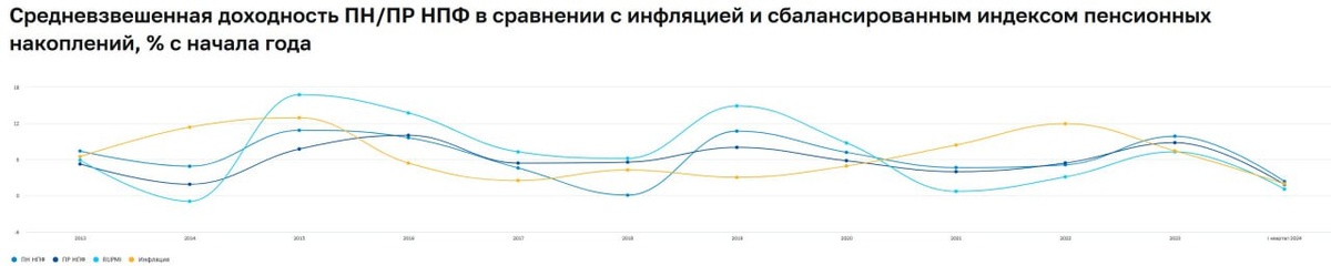 Среднегодовая доходность пенсионных фондов за 12 лет менее 6% (существенно ниже доходности по вкладам и реальной инфляции) На сайте ЦБ России появилась аналитика «Доходность НПФ» cbr.ru/analytics/RSCI/activity_npf/dokhodnost-npf-1-24/ Среднегодовая доходность пенсионных фондов за 12 лет составляет около 6% (ниже ставок по вкладам и ниже среднегодовой инфляции) Реальная доходность ниже, т.к. эти графики показывают доходность до вычета вознаграждения (надо же ещё содержать эти фонды, за счёт тех, чьими сбережениями управляют, т.е. за счёт всех нас). Пенсионные фонды вкладывают деньги в долговые инструменты. Интересно, Минфин России совместно с Центробанком и участниками рынка прорабатывает возможность запуска торгов криптовалютой внутри страны для суперквалифицированных инвесторов (от 100 млн на счетах). если введут эту категорию, то в неё попаду. Даже суперквалифицированным инвесторам нет возможности самим управлять своими пенсионными накоплениями. Думаю, не сложно догадаться, поч