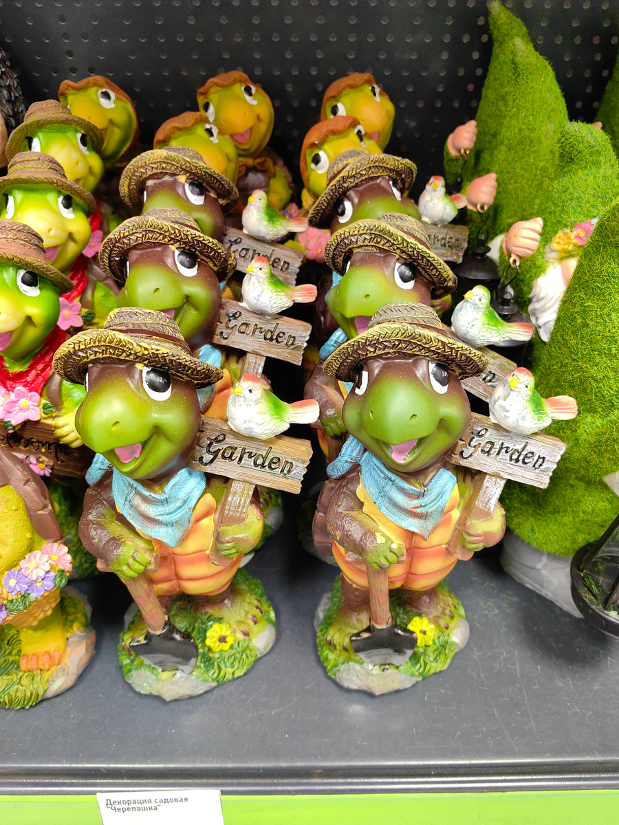 И сегодня не без новинок в Фикс Прайс, много всего выставили, от садовых до кухонных, большой выбор. Вот они, стоят себе на полке с теми самыми гномами из предыдущего обзора Fi price. Улыбчивые черепахи. Это такие фигурки для сада, будут охранять цветы. Черепахи разные, например, вот эта фигурка в соломенной шляпе, на шее яркий платок, держит табличку. Покажу, как выглядит с обратной стороны. Да, не идеально прокрашена. Или вот такая фигурка, черепаха в платочке, в корзинке цветы. Широко улыбается, приглашает заглянуть в сад. В последнее время много фигурок из полирезина, вытеснили керамику. А это третья фигурка, темнее, опять же, в шляпе из соломы (полирезин). На табличке крошечная птичка. За 299р. Много всего привезли, даже ежики появились, сонные, милые, глазки прикрыты, улыбаются. Такие фигурки ровнее выполнены, больше похожи на керамические. Лапки по-разному, ушки прикрыты. Сколько пересмотрела разных, все же ежиков два. Материал такой же, как у черепах, фигурка поменьше,