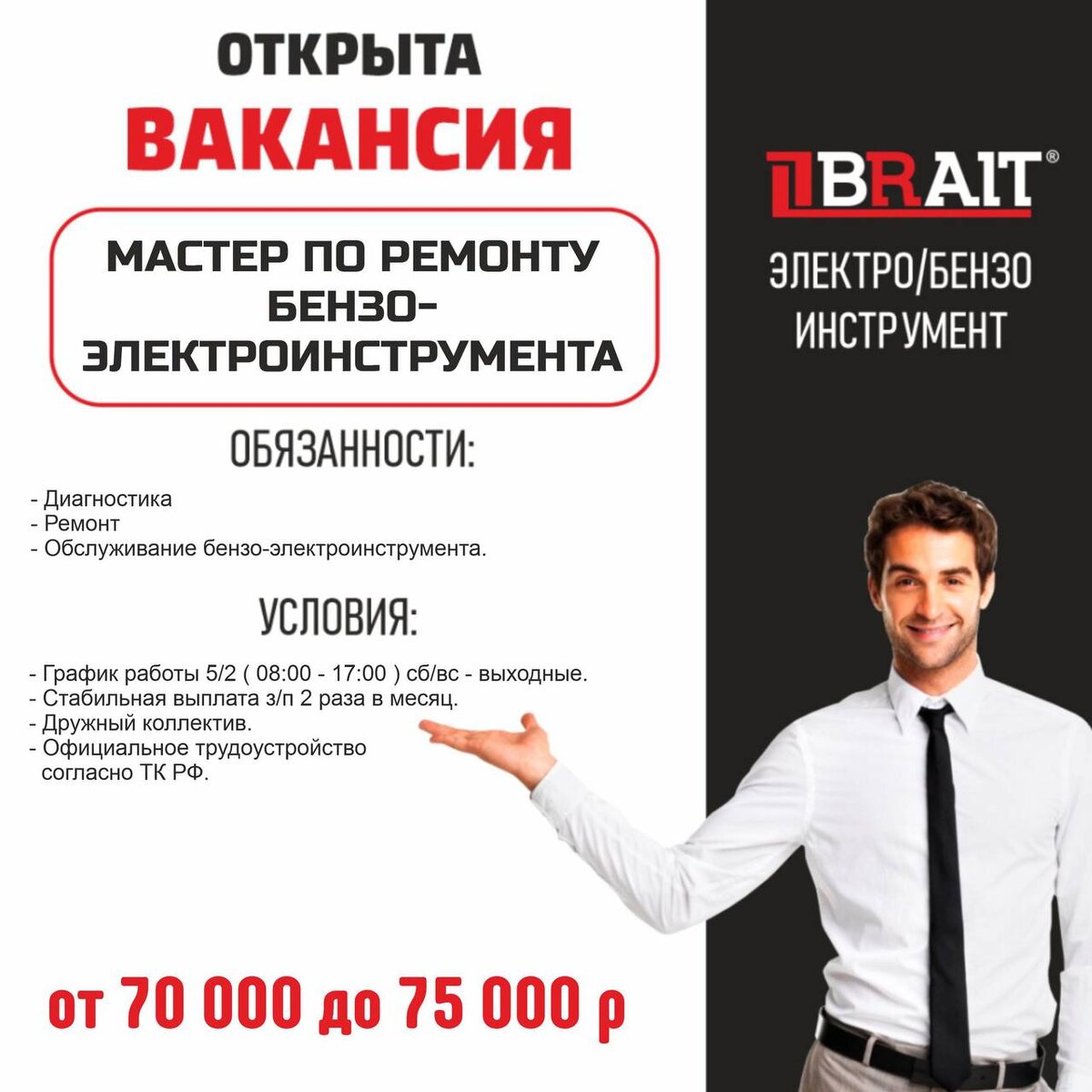 📣 ОТКРЫТА ВАКАНСИЯ! В связи с расширением организации и увеличения объема работ в наш дружный коллектив требуется: 📍Мастер по ремонту бензо-электроинструменту. 📌 Заработная плата: от 70 000 до 75 000₽. ✅ ОБЯЗАННОСТИ: - Диагностика. - Ремонт. - Обслуживание бензо-электроинструмента. ✅ ТРЕБОВАНИЯ: - Образование специальное. - Ремонт и диагностика бензо-электроинструмента. - Опыт в работе приветствуется (можно без опыта, но с образованием автослесаря). - Желание развиваться и зарабатывать. ✅ УСЛОВИЯ: - График работы 5/2 ( 08:00 - 17:00 ) сб/вс - выходные. - Стабильная выплата з/п 2 раза в месяц. - Дружный коллектив. - Официальное трудоустройство согласно ТК РФ. 📝Будем ждать Вашe резюме: ira.felbush78@mail.ru +7(342)206-65-55 с 10:00 до 17:00 +7(964)189-83-56 с 10:00 до 17:00 Частью нашей команды можешь стать именно - ТЫ!😉👍