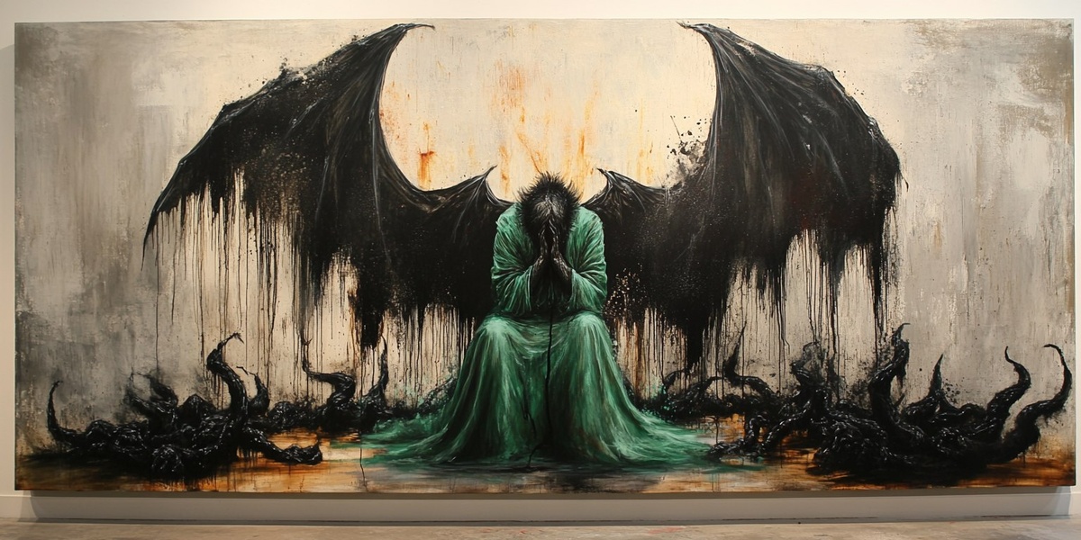 Создано на основе запроса: On the wall is a large painting. It is dressed in a green robe, carrying what looks like bat wings, and is praying to something divine. A large amount of bodily fluid is dripping from its body, and black demon-like creatures are swarming around it. --- Автоперевод: На стене большая картина. Как тебе такой вариант? 🤔 https://dzen.ru/id/65c0c65c86e4f837c27b24d7 #ИИ #AI #нейросеть #midjourney #art