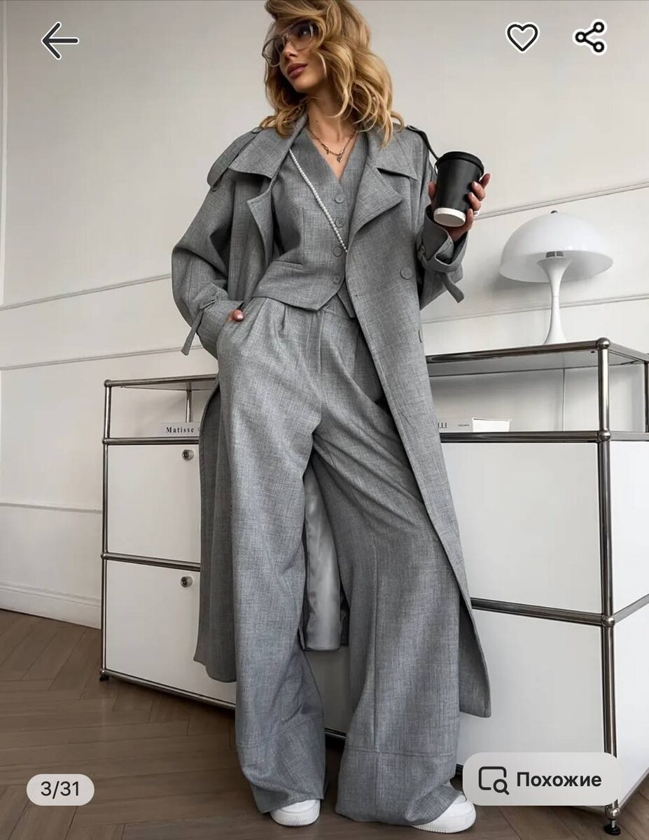Внезапно найдено на ВБ Костюм 3-ка тренч (только для сухой погоды), жилет и брюки Удивило высокое качество за 13 000 ₽ Примеряла только плащ. Хорошо будет от 175 Если надо ссылку, то дайте знать