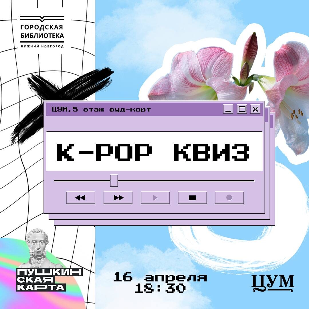 🔠🔠🔠🔠🔠квиз (16+) 😎😎😎 📆16 апреля ⏰18:30 📍ЦУМ, 5-й этаж, сцена 🎫Зарегистрировать участие можно по ссылке Готовы ли вы окунуться в этот мир, где каждый бит пульсирует жизнью, где каждая мелодия рассказывает историю страсти и мечты?❤️ 🏆Мы погрузимся в мир южнокорейской культуры К-ПОП, чтобы проверить свои знания и получить за это крутые призы! 💭Пусть удача сопутствует вам в этом захватывающем путешествии! Файтин, друзья!