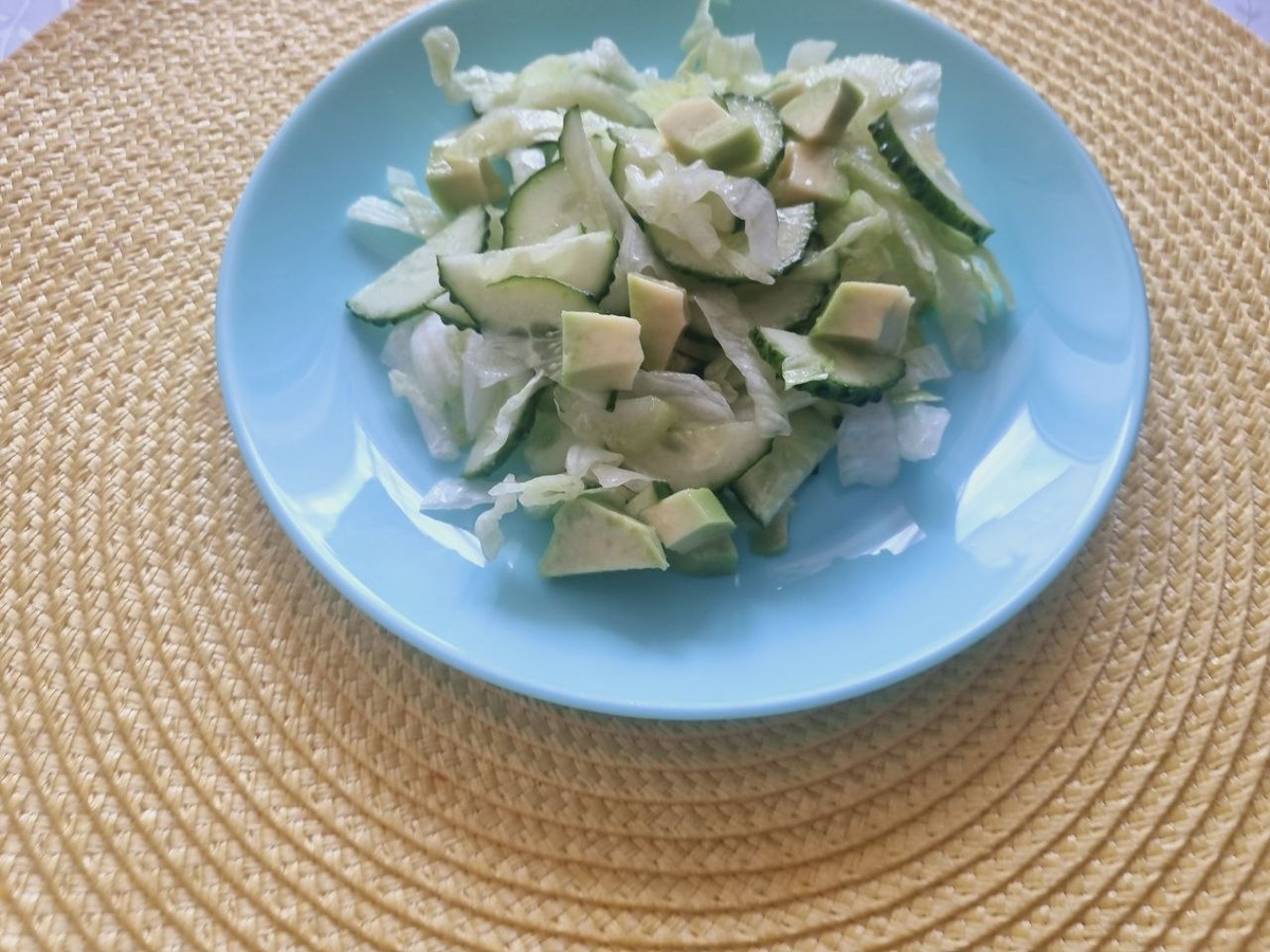 Продолжаем собирать салаты с айсбергом. На это раз выложу салат, который мы ели на ретрите. А так как это была практически первая нормальная еда там, то мне даже понравился сельдерей))) И сегодня, когда я ела этот салат, я поняла, что сельдерей у меня пропишется, пусть не так часто как остальные зеленушки, но покупать его я буду. Ингредиенты: Айсберг режем на ленточки, огурец на полукольца, сельдерей просто тонко нарезаем. В оригинале: вилкой разминаем авокадо, добавляем горчицу, лимонный сок (сначала добавьте 1 ст.ложку, попробуйте как вам на кислоту, если надо добавьте еще), соль, растительное масло и хорошо перемешиваем до состояния практически эмульсии. Это и будет наша заправка. Заправляем наш салат заправкой. Получается очень вкусно! У меня попался авокадо, который еще не готов был разминаться вилкой))) поэтому я его просто порезала и добавила в салат, заправив салат лимонно-маслянной заправкой. Вот так выглядел салат в составе тарелки)